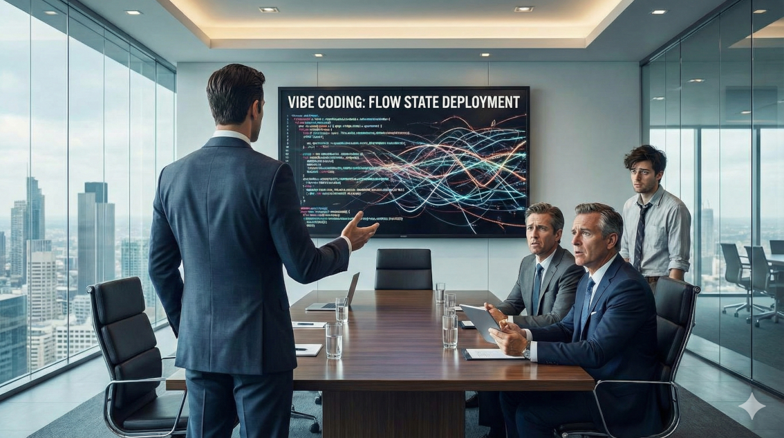 „Sicherheit ist ein State of Mind“, unterbreche ich kalt. „Wollen Sie Innovation Leader sein oder weiter Formulare ausfüllen? Wir implementieren Vibe Coding jetzt. Sofortiger Rollout.“