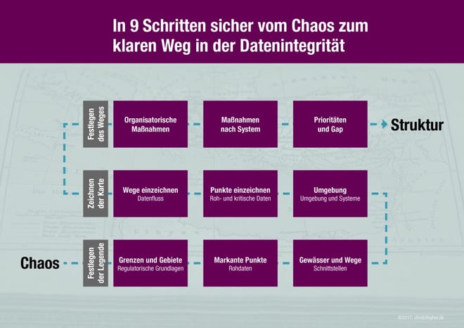 Wir befinden uns im ersten von drei Blöcken auf unserem Weg zur klaren Struktur in der Datenintegrität. Im ersten Block kümmern wir uns dabei um das Festlegen der Legende, also die rechtlichen Grundlagen, sowie das Definieren von Begriffen für den weiteren Prozess. Damit legen wir das Fundament für alle weiteren Schritte.